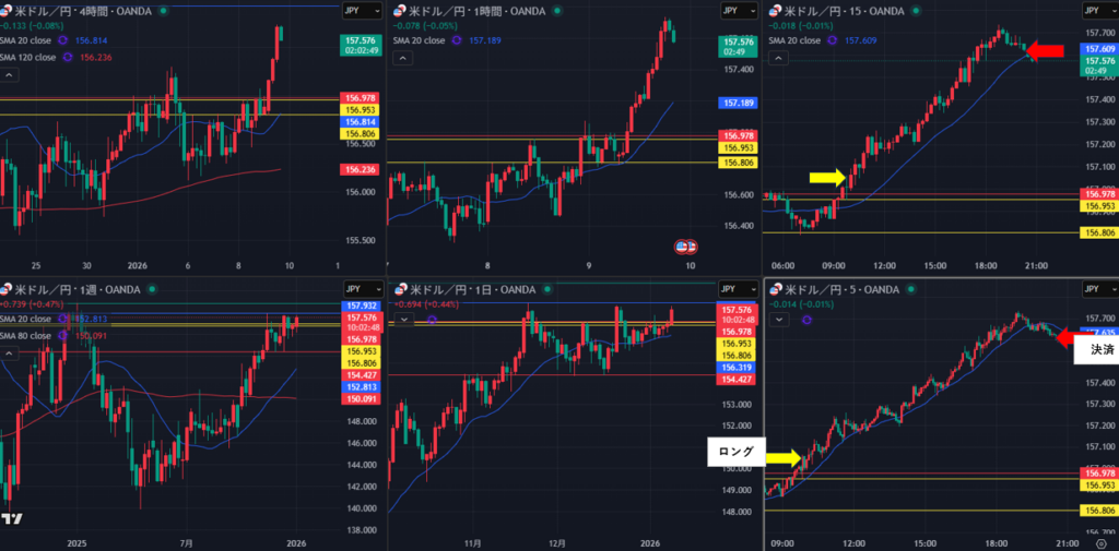 ロング 9:50 157.053 20:15 157.623 +57.0pips