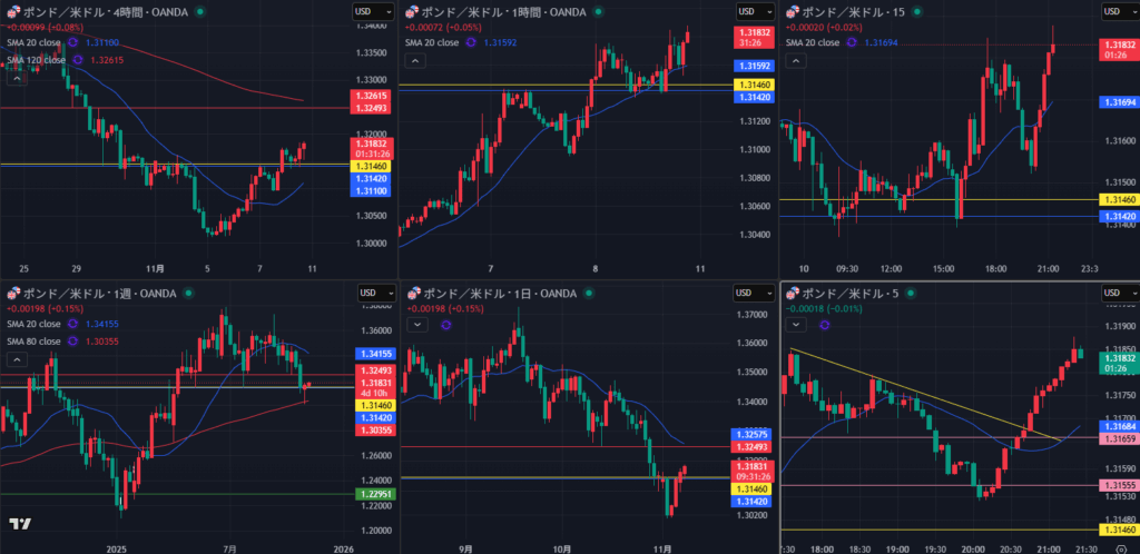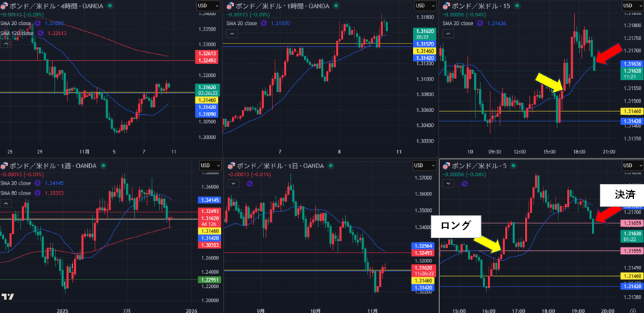 再エントリ 本来の4時間上昇狙いで見てたけど、15分の戻り売りが気になって5分斜め抜け