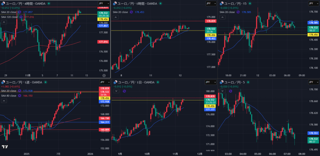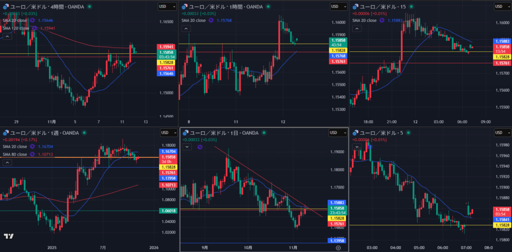 週足上昇トレンド中 日足が押し付けているところ 4時間利食い期終わったかな