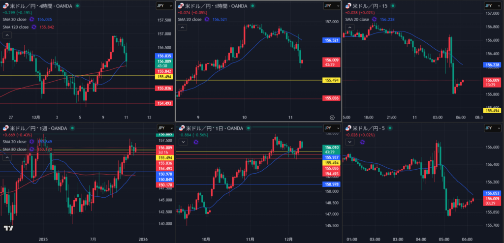 4時間(指標で大きく下落)は押し目買いが入るか待つ展開 節目はないが、日足のMAは注意