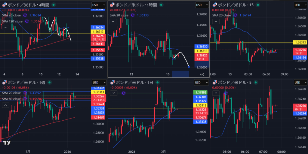 ユロドルよりポンドルの方が4時間戻り売りのイメージがつくな 1時間節目+MA反発で