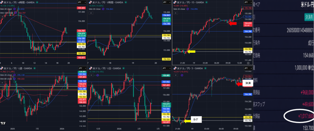 ロング 2/18(水)22:14 153.700 2/19(木)9:01 154.668 +96.8pips