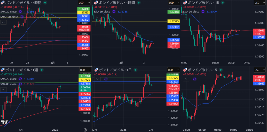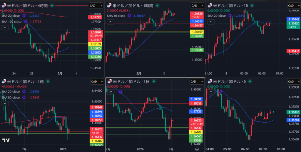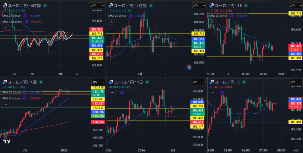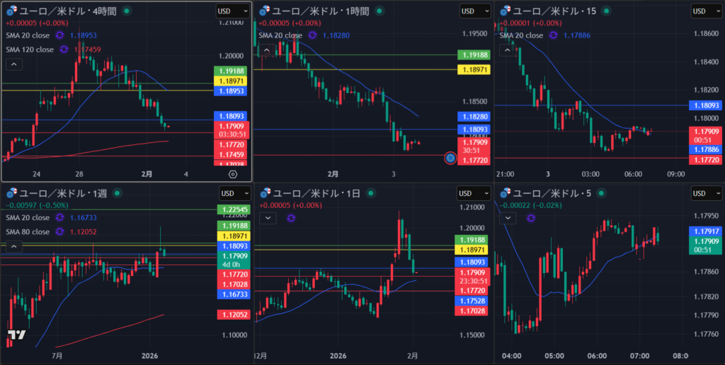 週足はちょっとヨコヨコの展開 日足がヒゲ連発で下にいきたくない感があるが、MA反発
