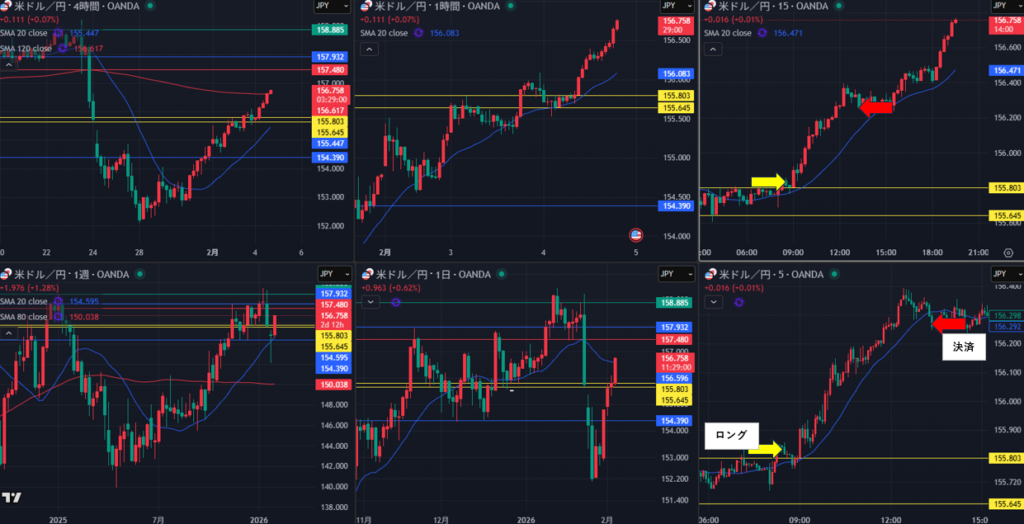 エントリー 8:21 155.833 決済 13:24 156.26 +43.4pips