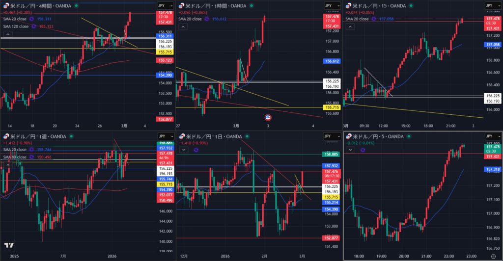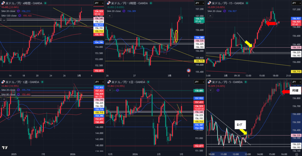 3/2(月)ドル円 ロング 12:57 156.338 15:49 156.886 +54.8pips