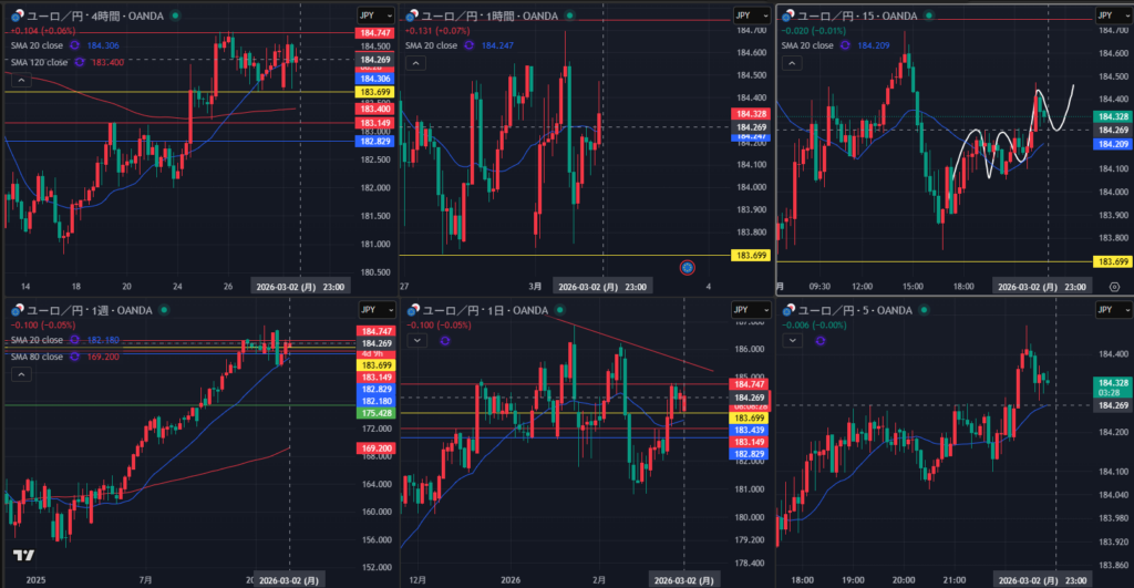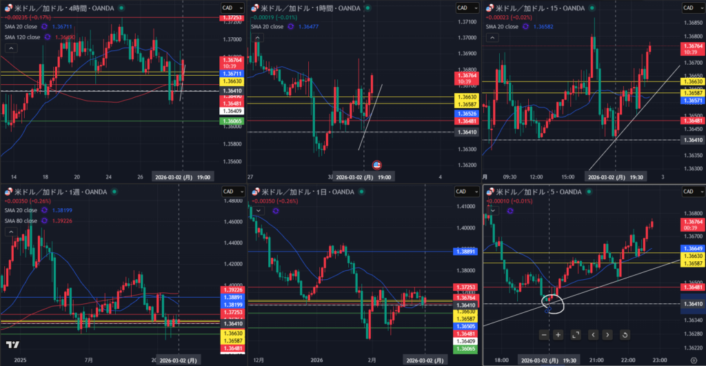 そこから5分のトレンド転換が15分のWでサポートされるのを確認しながら1時間の軸の感覚が