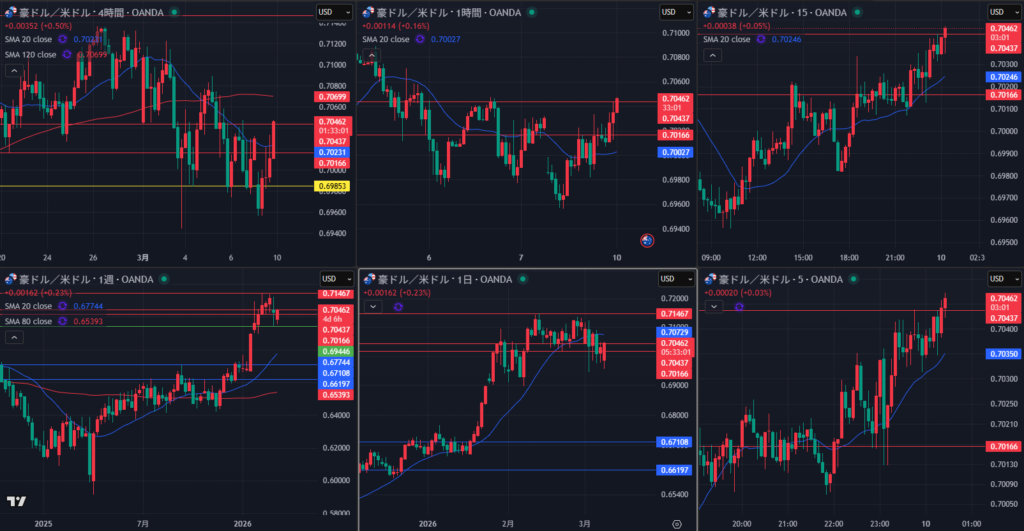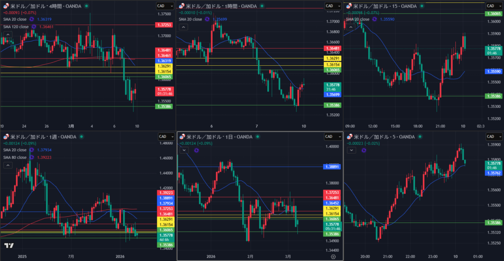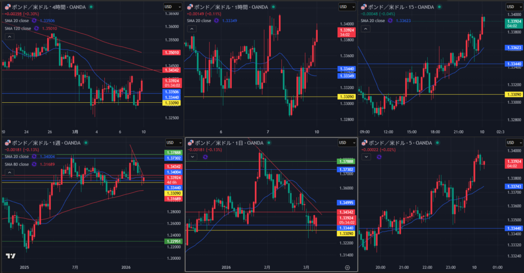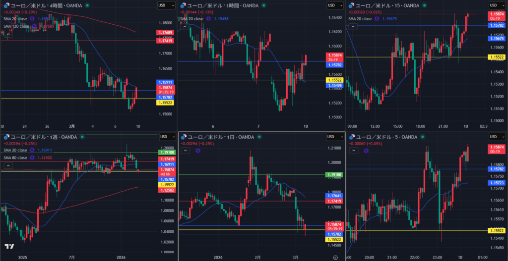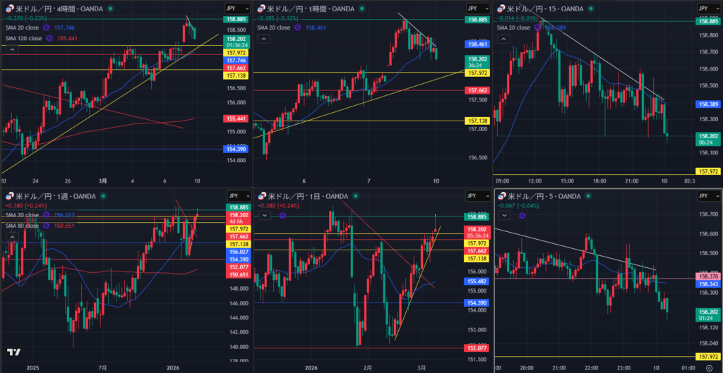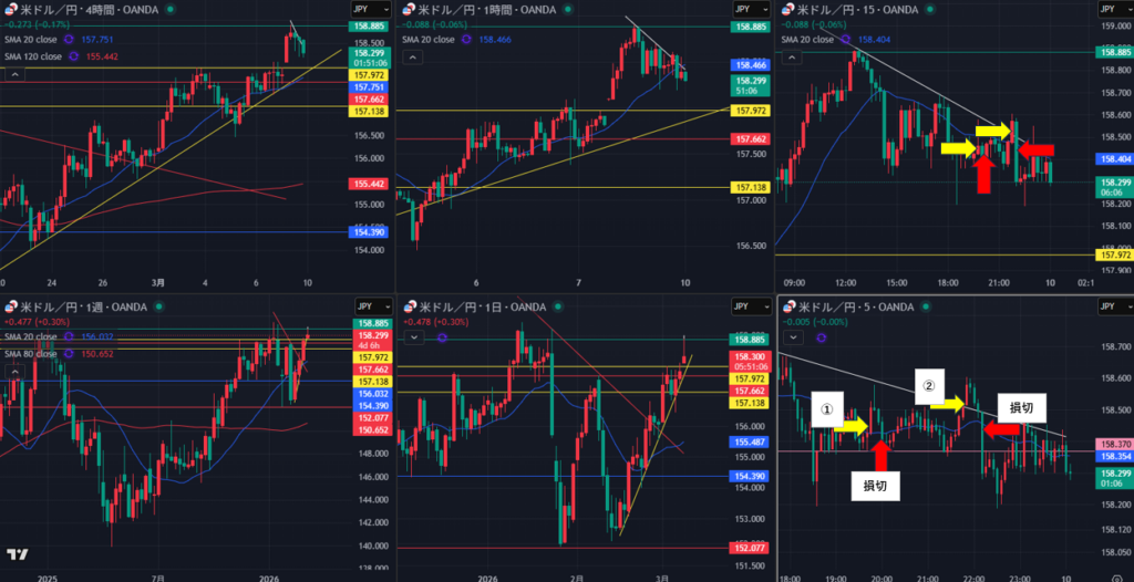 3/9(月)ドル円 ロング ①19:46 158.446 20:03 158.415 -3.1pips